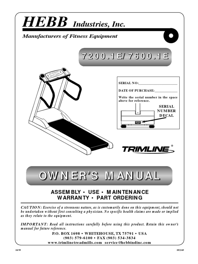 A trimline 7600.one treadmill in good working condition. Treadmill by maker of trimline. Hebb industries treadmill 3550 parts. Transitional design 601 towpath rd. There are trimline treadmill also 7200 manual many cheaper alternatives.